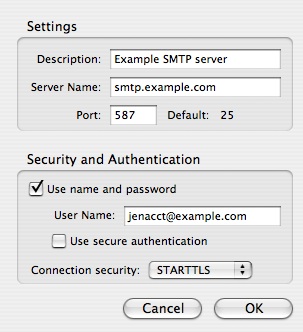 • outgoing mail server and port (for example, “smtp.example.com” and port 25). If you subscribe to our SMTP service your outbound settings were sent to in a welcome email.
