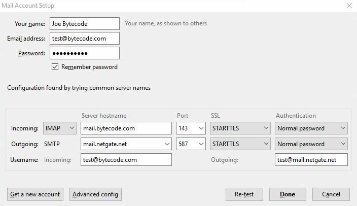 Click Re-test to test your manual settings; there should be a quick response indicating the settings are valid. If not, press the Stop button to abort the lookup, then edit the server names, ports and IMAP/POP and click Re-test again. After the pressing Done  button the account should be setup and you should be able to send and receive emails.