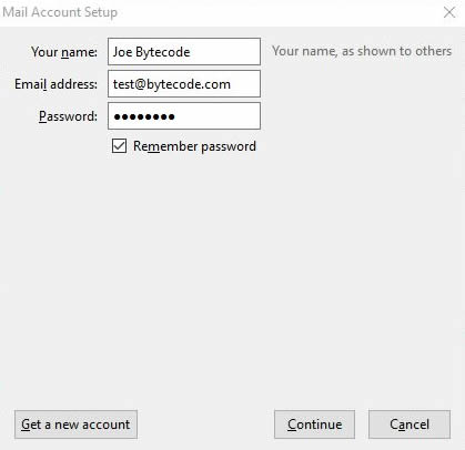 Enter your email account details and press Continue. Thunderbird will try to determine your account settings based on the domain portion of your email address (that is, the portion after the “@” symbol).