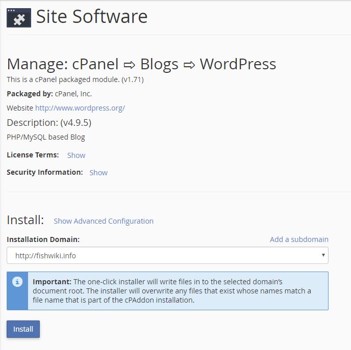 To install into the default location (the document root of your website) click “Install”. Otherwise, click on “Advanced Options” and make the needed changes before clicking “Install”.