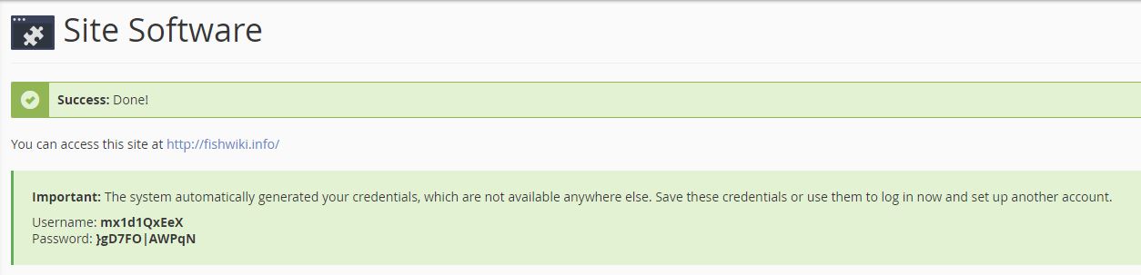 Once the install has completed you’ll see this (the Username and Password displayed below are fictional).